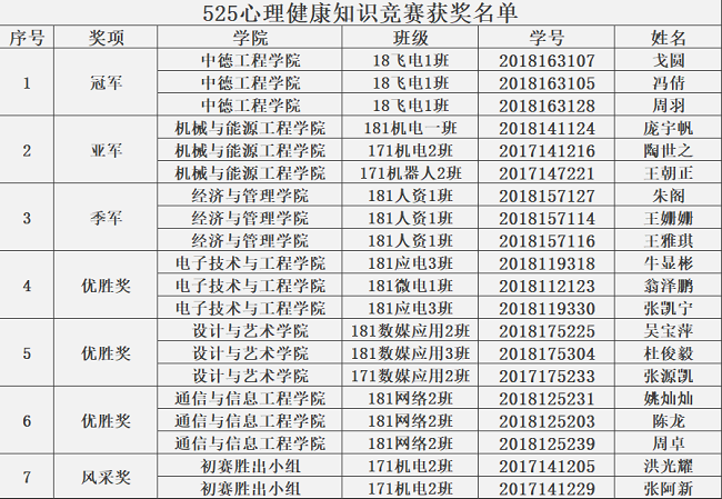 上海电子信息职业技术学院2019年度心理健康知识竞赛获奖名单公示2019年5月,由上海电子信息职业技术学院主办,机械与能源工程学院承办的525心理健康月系列活动——心理健康知识竞赛顺利落幕。