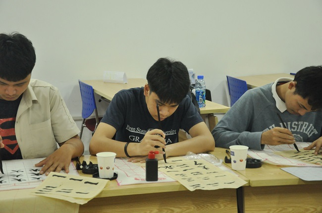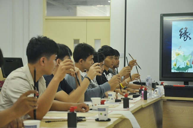 中国文字魅力传遍全世界,而其中最能体现文字之美的形式就是书法。在我院举办的学写中国书法活动中,书法社的同学们首先向泰国同学们展示了如何开笔、握笔、蘸取墨汁等,而后进行了示例写作,并手把手地教他们如何下笔书写,同时详细讲解了笔触以及字形的内涵。交流生们志趣盎然,纷纷跃跃欲试,不断尝试书写不同的文字。最后,书法社的同学们将精心准备的象征着中泰友好的书法作品赠送给泰国友人。此次活动加深了交流生们对中国文字艺术的了解。