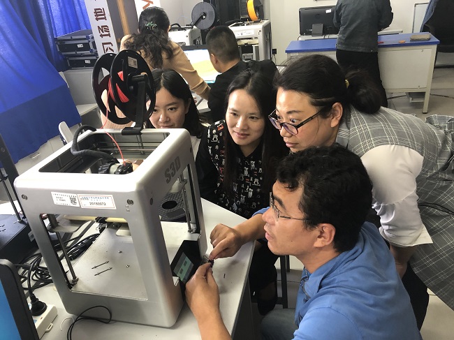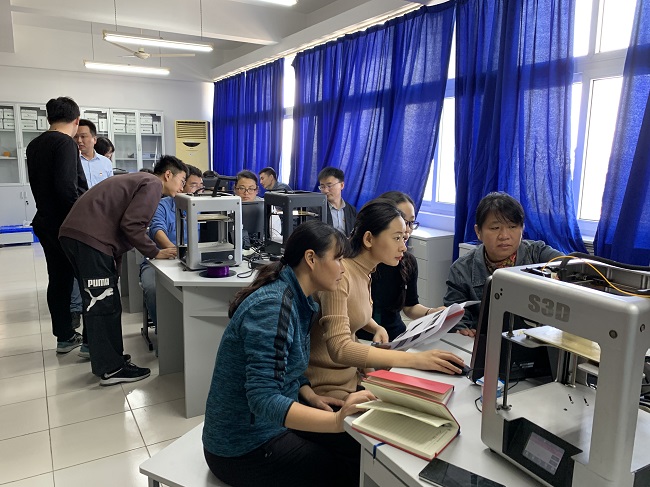 乐老师将党员分成若干小组,每个小组配备一位3D打印工作室学生助手。首先,乐老师向党员们展示了提前打印好的党徽成品,并带领大家重新认识党徽的构成以及图案的象征意义。然后,乐老师详细讲述了党徽的演变过程,从1922年河北开滦五矿工人大罢工,讲到中国共产党成立75年后,党旗党徽有了统一而明确的规范。接着,乐老师讲解了3D打印的原理,并指导党员现场操作。党员们在学生助手的协助下着手打印党徽。最后,乐老师重点强调了党员佩 戴党徽的意义。