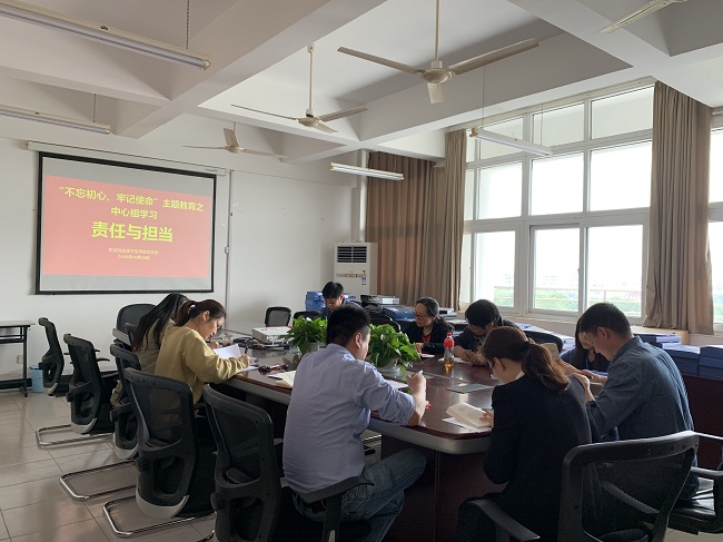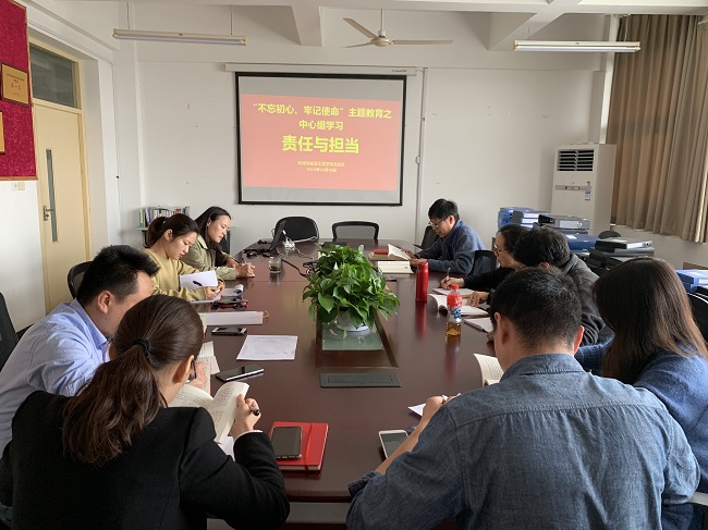 为深入学习贯彻习近平新时代中国特色社会主义思想,树牢责任意识,充分发扬担当精神,我院中心组于2019年10月28日以“责任与担当”为主题集中学习了《习近平关于“不忘初心、牢记使命”论述摘编》(以下简称《摘编》)。会议由党总支书记何永艳主持,中心组成员到场参加。