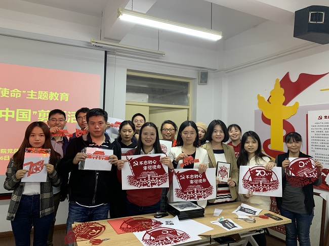 活动伊始,党总支书记何永艳介绍了李海烽老师,并阐述了本次活动的意义,要求大家以“新中国成立70周年”和“不忘初心、牢记使命”为剪纸主题,认真体会中国传统文化的魅力和手艺人的匠人精神,深入思考自己的初心和使命。接着,李老师展示了一些剪纸成品,讲述了剪纸的方法和要领,并做了演示。随后,李老师指导在场的同志进行练习。大家迫不及待拿起剪刀和红纸,小心翼翼聚精会神地剪出自己的作品,完成之后,大家将作品进行了集中展示。由李老师完成的“不忘初心、永跟党走”大幅剪纸作品将在N509党员活动室悬挂展示,激励党员们在政治上和行动上与以习近平同志为核心的党中央保持高度一致,在新时代贯彻党的教育方针,落实立德树人根本任务。
