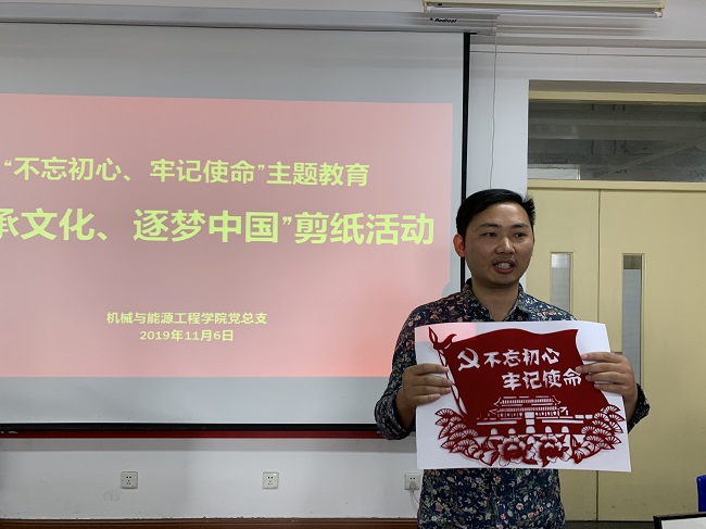 “花团锦簇的天安门上空飘扬着鲜艳的党旗,上面赫然醒目的几个大字‘不忘初心、牢记使命’”、“白色和平鸽在五星红旗的映照下,飞向新中国的‘70周年’”……一幅幅精致的剪纸作品让机械与能源工程学院党员活动室蒙上了一层艺术的色彩。红色彩纸与红色党旗交相辉映,传统文化与党的精神交汇融合。在“不忘初心、牢记使命”主题教育火热开展的时刻,机械与能源工程学院党总支于11月6日在N509党员活动室为大家带来了一场别样的艺术体验。活动特别邀请到中国非物质文化遗产剪纸艺术传承人李海烽老师前来授课,党总支书记何永艳、副书记倪娜出席活动,全体党员、民主党派、入党积极分子及群众代表到场参加。