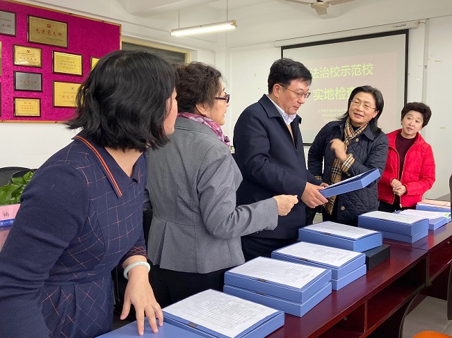 2019年11月29日,我院接受上海市依法治校示范校建设工作实地检查,本次检查通过实地查看、听取汇报、调研座谈、查阅资料等形式展开。在校长杨秀英和副校长窦争妍的带领下,检查组于下午来到我院检查二级学院开展依法治校工作的情况。我院党总支书记何永艳,副书记郭华、倪娜,副院长陈永平出席调研座谈会,学院相关行政工作负责人到场参加。