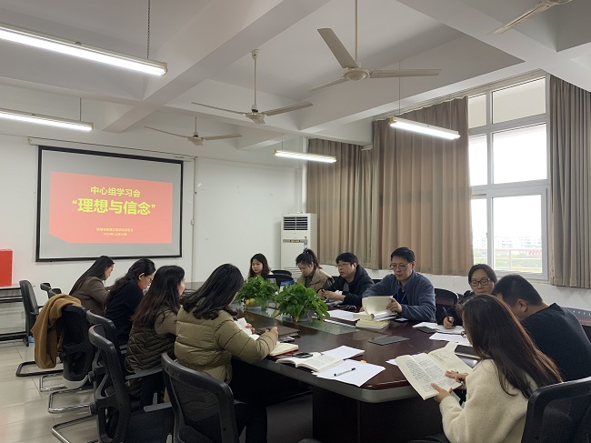 郭老师领读了《摘编》中关于“理想与信念”的部分,并带头发表了学习体会。郭老师强调,信仰、信念、信心,任何时候都至关重要,小到一个人、一个集体,大到一个政党、一个国家,只要有信仰、信念、信心,就会愈挫愈勇、愈战愈勇,否则就会不战自败、不打自垮。接着,中心组成员围绕主题展开研讨交流,大家充分发表观点,气氛热烈。傅卫沁老师表示,作为教育工作者,要始终坚决拥护党、追随党,忠诚于党和人民的教育事业,自觉坚定中国特色社会主义的信仰,静心教书潜心育人;乐旺锋老师认为,无论处在什么岗位,都应有理想信念,既要胸怀大志,更要立足现实,着眼本职岗位,扎扎实实从小事做起,从自己做起;王晨怡老师认为,坚定理想信念,自觉用习近平新时代中国特色社会主义思想指引教育实践发展,练就过硬政治本领,做政治上靠得住的“四有”好老师,是新时代高校教师的政治担当与职责所在。