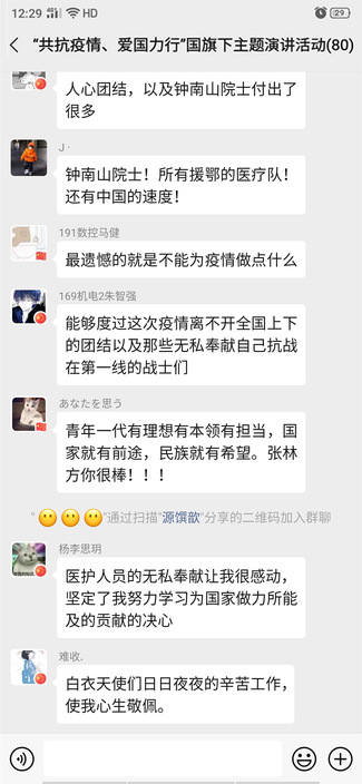 活动以在线奏唱国歌的环节开始,随后参赛者依次进行国旗下主题演讲。191数控1班马健将新冠肺炎疫情发生以来的感受通过演讲的方式展现出来。191机电3班退伍军人张林方为我们分享他的抗疫经历,向我们彰显了退役不褪色的新时代军人本色。191机器人2班途涂将抗疫中一个个坚毅的脸孔通过短视频的形式展现出来,这不禁想起“哪有什么岁月静好,只是有人替我们负重前行”。由191机器人2班贺宇豪和169机器人(贯通)钱园颖共同讲演的《抗击疫情,机械学子在行动》,向同学们展示了身边那些放弃休息时间,投入到抗疫中的学生志愿者们,让同学们切身感受到“共抗疫情、爱国力行”的实际意义。期间,同学们热烈讨论,表达了对演讲者由衷的赞赏。最后,通过微信小程序,同学们都统一换上了带有国旗的头像,大家高举国旗,带着心中的爱国情结,表达身为一名中国人的骄傲。