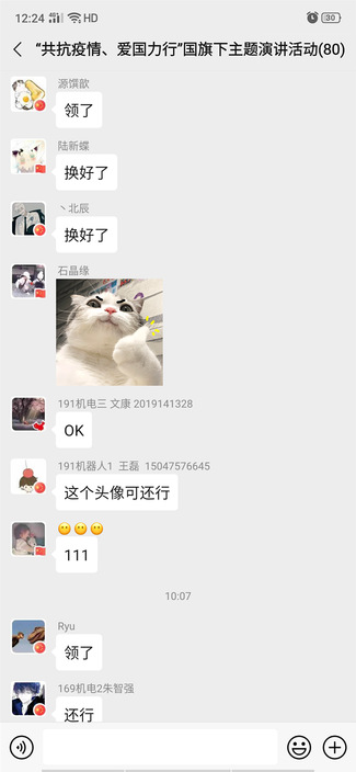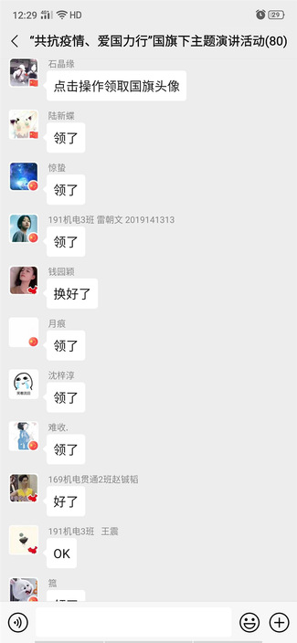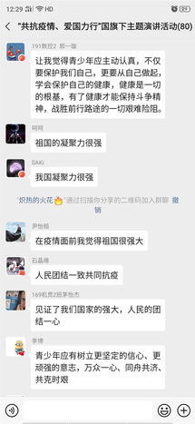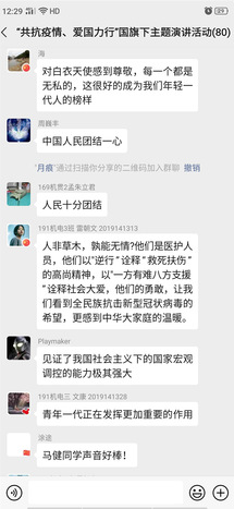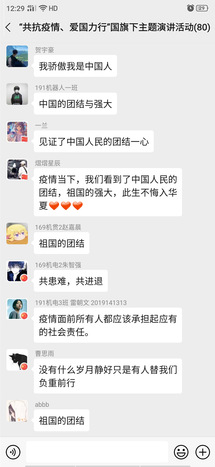 活动以在线奏唱国歌的环节开始,随后参赛者依次进行国旗下主题演讲。191数控1班马健将新冠肺炎疫情发生以来的感受通过演讲的方式展现出来。191机电3班退伍军人张林方为我们分享他的抗疫经历,向我们彰显了退役不褪色的新时代军人本色。191机器人2班途涂将抗疫中一个个坚毅的脸孔通过短视频的形式展现出来,这不禁想起“哪有什么岁月静好,只是有人替我们负重前行”。由191机器人2班贺宇豪和169机器人(贯通)钱园颖共同讲演的《抗击疫情,机械学子在行动》,向同学们展示了身边那些放弃休息时间,投入到抗疫中的学生志愿者们,让同学们切身感受到“共抗疫情、爱国力行”的实际意义。期间,同学们热烈讨论,表达了对演讲者由衷的赞赏。最后,通过微信小程序,同学们都统一换上了带有国旗的头像,大家高举国旗,带着心中的爱国情结,表达身为一名中国人的骄傲。