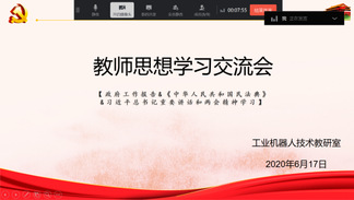 教研室主任带领大家认真学习了习近平的重要讲话精神、《政府工作报告》以及《民法典》的相关内容,让大家在忙于教学工作的同时,及时跟上时政大事的步伐。教师们就学习内容展开热议,工业机器人教研室重点学习了《民法典》的产生过程和意义,教师们认为《民法典》切实遵循了“人民至上”的原则,以保障人民利益为重,要认真学习,沉浸于全民尊法、学法的浓厚氛围,养成自觉守法、用法的强烈意识。电气自动化教研室提到,政府工作报告让老百姓看到了一个真心实意为人民服务,彰显浓浓民生情的人民政府,作为老百姓在享受国家福利的同时也要做出贡献。在全面建成小康社会、实现第一个百年奋斗目标的关键之年,教师应当牢牢把握时代提出的新要求,培养符合社会需求的时代新人。数控教研室说到,习总书记的重要讲话触及人民内心,激发了大家强烈的民族自豪感。虽然近年来我国发展面临诸多困难和挑战,未来也会有很多挑战,但是坚信在党的领导下,终会冲破险阻,实现伟大目标。机电一体化教研室表示,今年的“两会”不论形式还是内容都与以往不同,推迟召开、会期缩短、形式变化、议题务实,聚焦民众所想所盼急需解决的大问题。目前国内外疫情仍在蔓延,要认真落实“两会”给出的方针,时刻绷紧疫情防控这根弦。