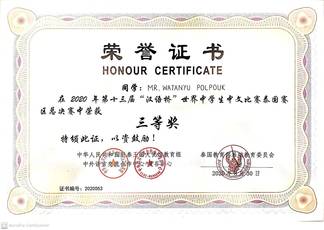 2020年8月30日,由中国教育部中外语言交流合作中心主办,中国驻泰王国大使馆教育组、泰国教育部基教委、中国语合中心曼谷中心承办,以“追梦中文,不负韶华。Fly high with Chinese——中泰手足情,绵延千秋好”为主题的第十三届“汉语桥”世界中学生中文比赛泰国赛区决赛在泰国曼谷成功落幕。