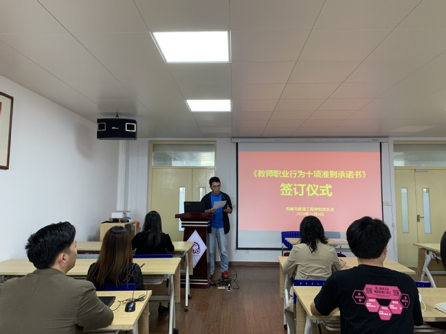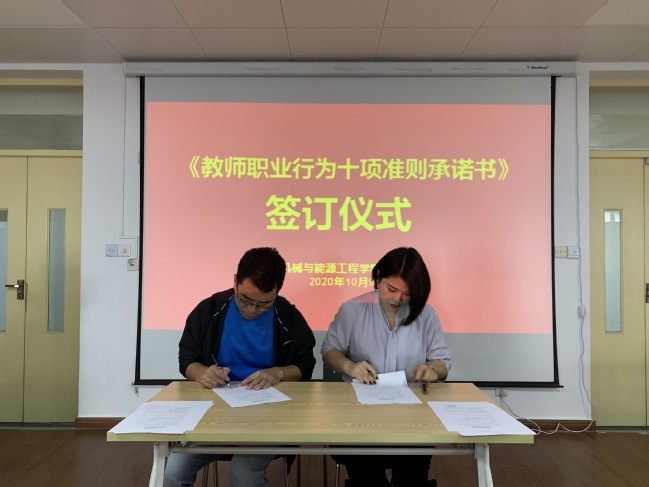 为落实习近平总书记对教师的相关要求,全面推进教师队伍建设,规范教师职业行为,提升道德修养,践行“为人师表”,机械与能源工程学院党总支于2020 年10月9日在N514举办了《教师职业行为十项准则承诺书》签订仪式。党总支书记何永艳、副书记郭华、倪娜、副院长陈永平出席会议,新教师到场参加。会议由组织员王晨怡主持。