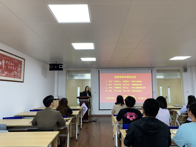 会上,何老师从四个方面对新教师提出了要求,一要牢记“为党育人、为国育才”的初心和使命;二要践行“学高为师、身正为范”的德操和风范;三要传承“尚德修能、知行合一”的校训精神和追求;四要树立“安心从教、热心从教”的理念和信心。何老师强调,要处处以“四有”好老师标准严格要求自己,虚心学习充电,潜心教书育人。随后,新教师代表窦瑞军领读了《教师职业行为十项准则承诺书》的内容,教师们轮流上台签订承诺书。