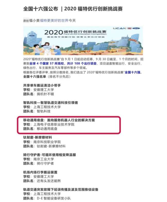 由福特(中国)与恩派公益联合主办的“2020福特优行创新挑战赛”自9月1日起启动招募,9月30日截止,历经1个月时间,共招募到全球4个国家57所高校,共计108个项目参赛,涵盖智能出行、安全出行、绿色出行、车主服务、出行新型材料、智能出行模式等多个领域。我校机械与能源工程学院学生团队“移动通用地盘:面向服务机器人行业的运动解决方案”项目报名参赛,并在全国108个项目中脱颖而出。10月16日福特官方微信公众号公布初赛结果,我校“移动通用底盘”项目成功晋级“2020福特优行创新挑战赛”全国十六强。