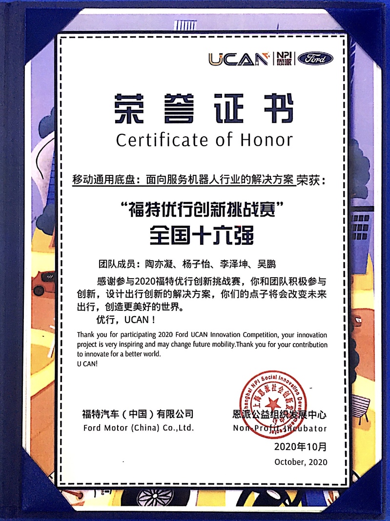由福特中国与恩派公益联合主办的“2020福特优行创新挑战赛”招募全球4个国家57所高校,共108个项目参赛,涵盖智能出行、安全出行、绿色出行、新型材料等多个领域。机械与能源工程学院何永艳、倪娜、王凯凯等老师指导的学生团队“移动通用地盘:面向服务机器人行业的运动解决方案”项目报名参赛,历经创新项目设计、项目计划书撰写、路演、行业信息、创业经验、大咖分享、全方位打造创业学堂等过程,在全国108个项目中脱颖而出,荣获“2020福特优行创新挑战赛”全国十六强。