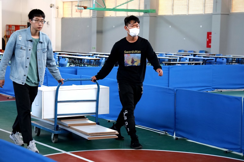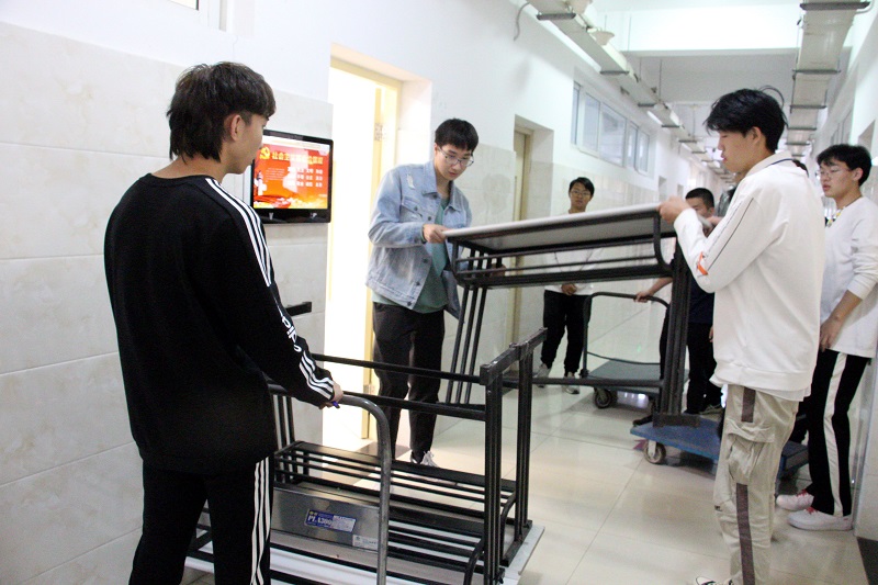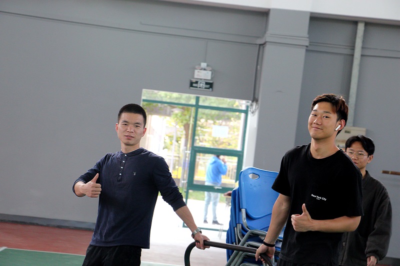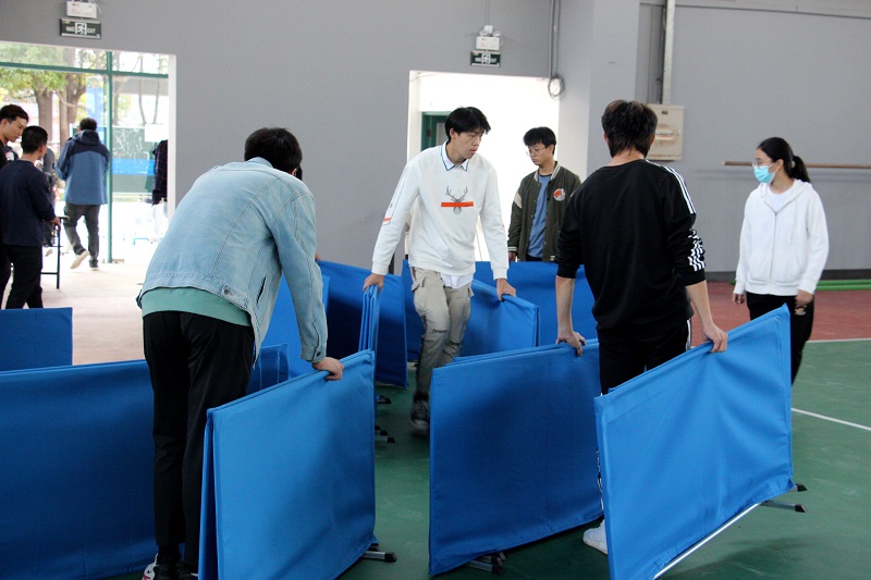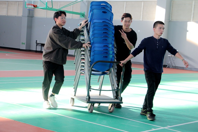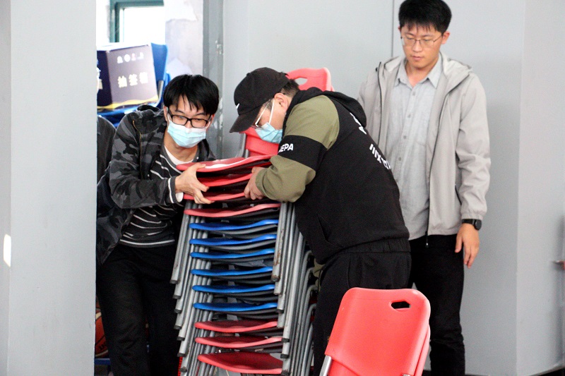 会场布置工作在筹备人员相互协作下有序进行,一部分人员着手于会议区域的桌椅布置,将座椅搬到主席台前摆放整齐,并从教学楼中搬来长桌布置成讲台供会议使用。与此同时,位于场地后方的人员也在有条不紊进行着比赛区域的划分,部分人员负责用隔断将主赛场分隔成若干个小区域,另一部分将摆放在N楼的比赛道具拆卸并搬运到比赛现场,并在现场老师的指导下将道具在会场重新组装起来,组装完成的比赛道具在工作人员的安排下被摆放在相应的赛场位置。场地布置任务初步结束后,现场工作人员又对会场进行了一次检查,并在确认安排妥当后结束了今日的会场布置任务。