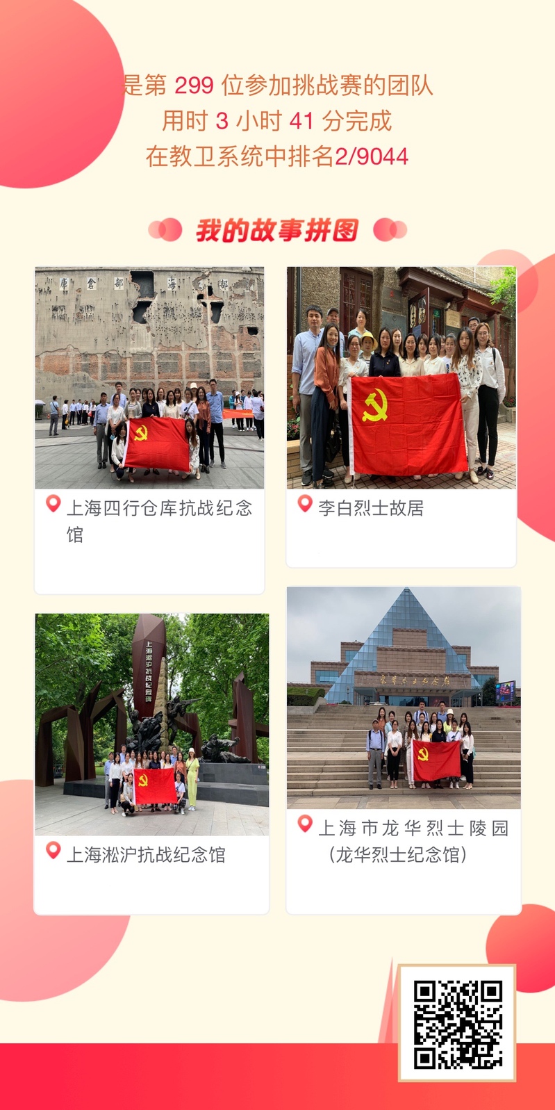 年轮滚动,足迹犹在,岁月流逝,初心不改。为迎接建党一百周年,充分调动党员的党史学习热情,提升支部凝聚力和战斗力,机械与能源工程学院教师党支部和学生党支部积极开展“我为建党百年打卡”活动,于2021年6月4日连续打卡上海龙华烈士陵园、上海淞沪抗战纪念馆、上海四行仓库抗战纪念馆和李白烈士故居纪念馆。党总支书记何永艳、副书记郭华、副院长陈永平及各支部党员共同参加活动。