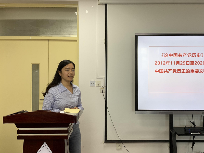 党总支副书记、副院长倪娜阐述了《论中国共产党历史》这本书的编辑背景以及基本内容,以故事、图片和视频的形式,更为直观的向大家展示了这本书所要表达的立场和态度。倪老师分享了自己的学习过程和体会,同时要求大家重点从六个角度把握这本书的精神内涵,即感悟马克思主义的真理力量;把握历史发展规律和大势;深刻认识党的性质宗旨;从历史经验中提炼出克敌制胜的法宝;赓续共产党人精神血脉;增强党的团结和集中统一。随后,中心组成员就学习内容展开交流。孙丽兵老师谈到,作为新上任的教师党支部书记,将沉下心来学深悟透习近平新时代中国特色社会主义思想,从党史中汲取经验智慧,在基层党组织建设和学院发展中有所作为。侯涛老师认识到,当前我们正面临百年未有之大变局,党员教师要带头弘扬和发展革命精神,以坚定的信念和意志战胜国内外各种风险挑战,带领青年学生走好新长征。