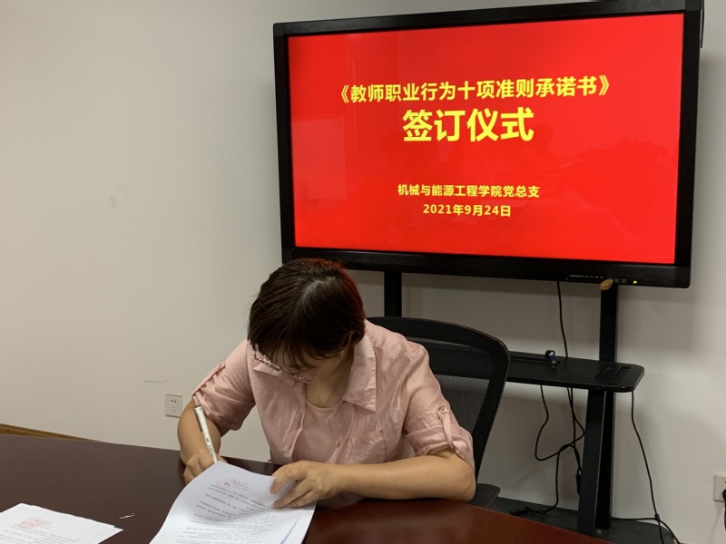 为规范教师职业行为,坚定职业信念,加强思想道德修养,塑造良好的教师形象,我院党总支组织新进教师于2021年9月24日在N514签订了《上海电子信息职业技术学院教师职业行为十项准则承诺书》(以下简称《承诺书》)。党总支书记何永艳、院长米红林、党总支副书记郭华、倪娜出席签订仪式,新进教师及部分教师代表到场参加。