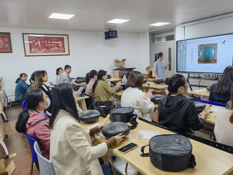 空灵鼓是一种起源于西方的民族乐器,进入中国后,经过中国传统匠人的改制融入了中国传统编钟的音阶和音色。和传统编钟不同,空灵鼓小巧玲珑,放置于桌面就能轻松演奏,集合了心灵疗愈和中国传统仙乐的特色。学院教职工在学院艺术讲师梁璐老师的带领下学习了中国简谱记谱方式,中国传统音阶学习和空灵鼓歌曲《送别》弹奏等内容。