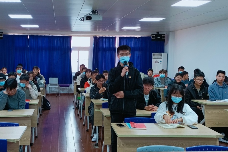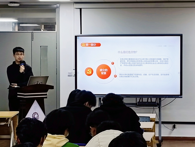 “党史记忆,铭记于心”红色拓展活动分为四个部分。第一部分,红色歌曲猜猜猜,需要依据听到音乐猜出红色歌曲名称,青马班学员对经典的红色歌曲耳熟能详,均积极抢答,现场氛围热烈,伴随着歌曲《少年》的合唱声,这一环节圆满结束。第二部分,古迹名胜识记竞赛,通过图片形式向青马班学员展现中国名胜古迹,其中历史的沉淀感不言而喻,引发学员们默默怀念革命先烈,不断追忆革命历程。第三部分,红色文物分享大会,21机器人2谢丰泽向大家详细介绍了铁剑、喇叭、鸡毛信等红色文物,他通过视频与讲述相结合的形式,极大提升了红色文物展示的呈现效果,带领青马班学员追寻历史印记,传承红色基因。第四部分,革命人物实景演绎,18机电(贯通)2班精彩演绎了“董存瑞舍身炸碉堡”的场景,以有声有色的形传播革命精神。