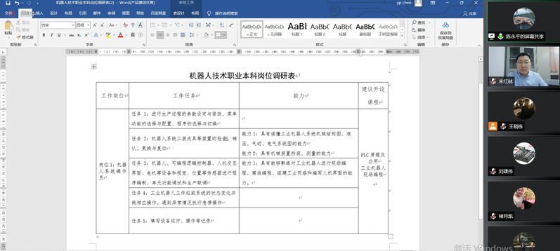 研讨会邀请上海飒智智能科技有限公司、上海ABB工程有限公司、库卡机器人(上海)有限公司、天津博诺机器人有限公司、上海达闼科技有限公司、峪流自动化(上海)有限公司、柯马(上海)工程有限公司、上海松盛机器人系统有限公司、上海通程汽车零部件有限公司9家企业共聚“云端”,就企业岗位设置、岗位任务、岗位能力进行了研讨。