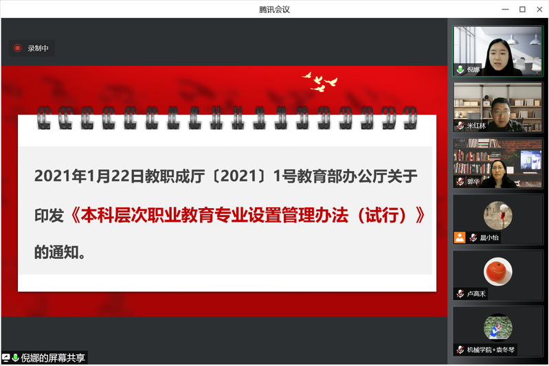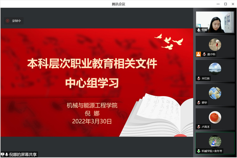 为树立职业教育新理念,明确本科层次职业教育的标准和要求,团结党员干部撸袖子、蹚路子,齐心协力做好职业本科创建工作,我院中心组于2022年3月30日集中学习了本科层次职业教育相关文件精神。党总支副书记郭华、副书记院长米红林、副书记倪娜、副院长陈永平出席学习会,与中心组其他成员齐聚线上。学习会由倪娜老师主讲。
