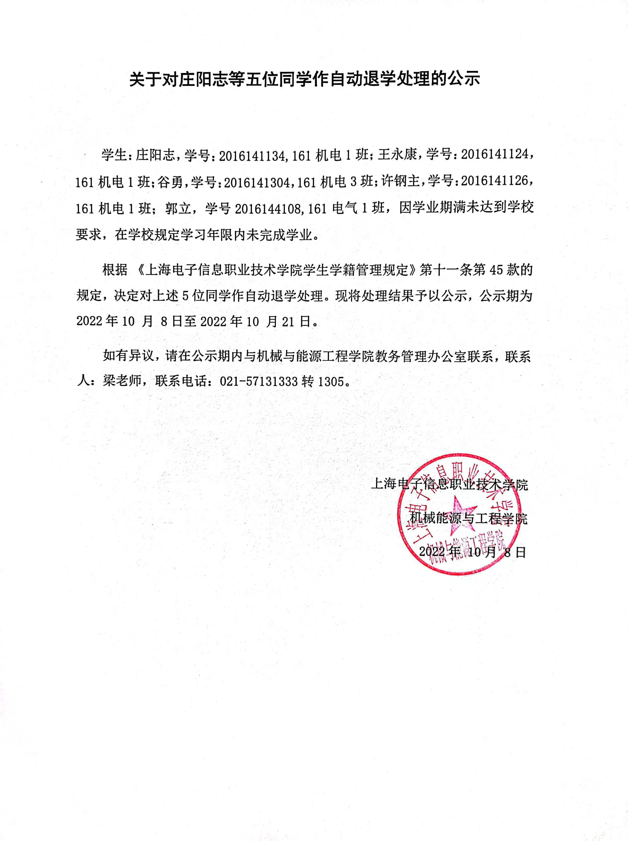 关于对庄阳志等五位同学作自动退学处理的公示