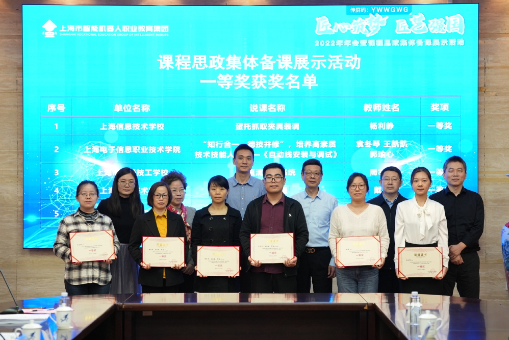 为深入推进习近平新时代中国特色社会主义思想进教材进课堂进头脑,充分发挥职业教育课程思政示范课程的引领作用,深化课程思政教学改革,创新课程思政教学模式,上海市智能机器人职业教育集团于2022年10月举办了第一届专业教师“课程思政集体备课”说课比赛。经过初评、培训、决赛、专家评审,我院自动线安装与调试课程团队成员袁冬琴、郭瑜心、王凯凯老师获一等奖,陈静老师获二等奖。