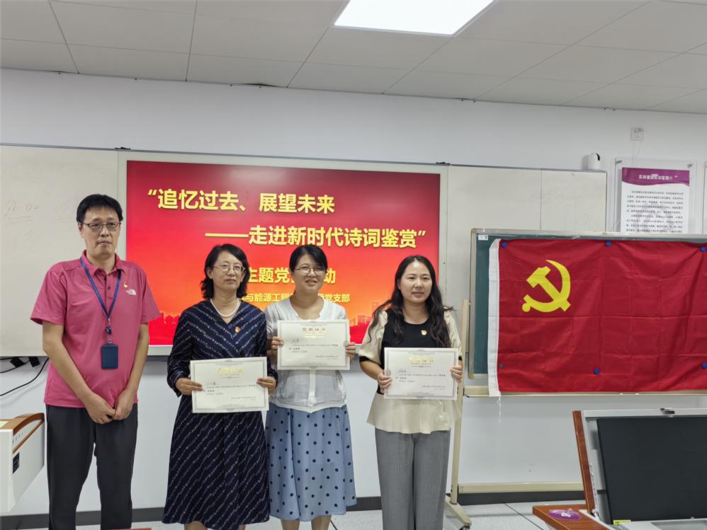 活动中,孙丽兵介绍了活动的内容和意义。支部4位党员分别朗诵了《赤潮曲》《毛泽东诗词三篇》《长征·七律》《习近平引用典故三篇》四篇诗词,并对诗词的出处、背景和意义作出深入解读,让在场老师感受到共产党人坚强的革命意志、崇高的建设中华的理想,同时也让我们坚定文化自信、涵养理想人生。活动评选了杜婧老师的《长征·七律》为最佳诗词鉴赏。