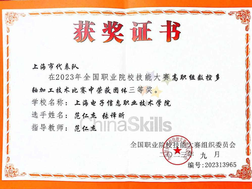 9月24日至27日,2023年全国职业院校技能大赛高职组数控多轴加工技术赛项在四川工程职业技术学院举行,来自全国各地的55支团队参赛。机械学院教师范仁杰和学生张译昕组队,作为上海市代表队之一参赛。经过激烈角逐,我院代表队荣获团体三等奖。