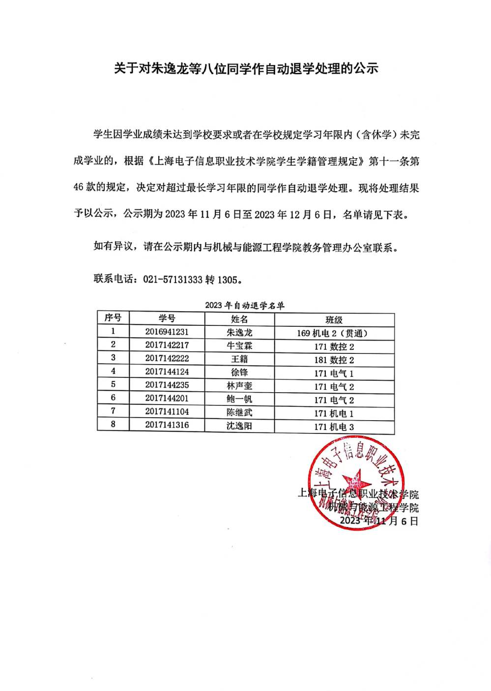 关于对朱逸龙等八位同学作自动退学处理的公示