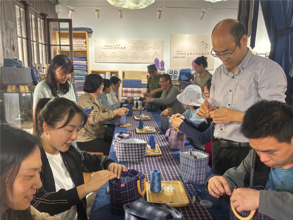 首先,大家来到庄行古镇纪念馆,馆内通过展板和实物展示了鼎丰酱园的发展历程和制作工艺。鼎丰酱园作为庄行古镇的标志性文化符号,其悠久的历史和精湛的技艺让人赞叹不已。随后大家体验了土蓝布工艺手提包制作,在非遗传承人指导下,教职工挑选自己喜欢的花色,亲手缝制了手提包。