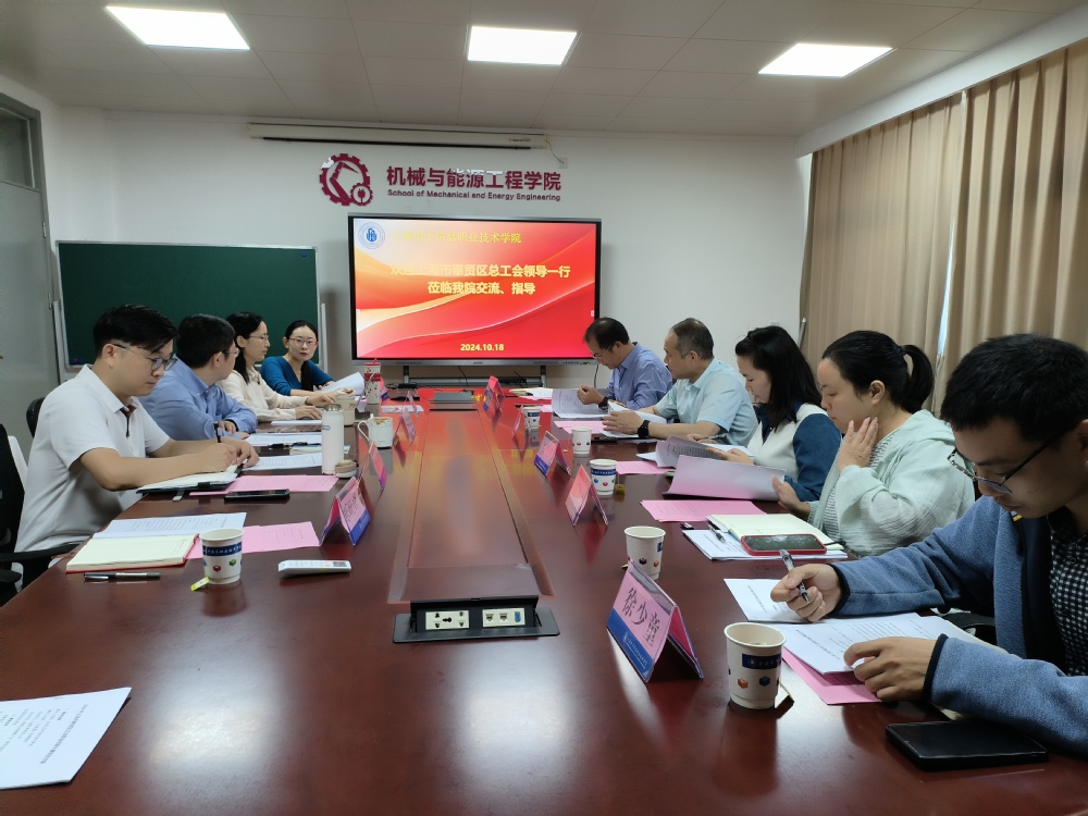 10月18日,上海市奉贤区总工会党组成员、副主席高平携奉贤区总工会基层工作部部长祝笑成、奉贤区总工会基层工作部主任科员夏伟、四团镇总工会副主席陈钢及四团镇、奉城镇总工会干事莅临机械学院指导奉贤区工会职工技能竞赛组织工作。机械学院党总支书记米红林、副院长(主持工作)郭华、继续教育学院副院长周志刚及负责2024年奉贤区总工会职工竞赛筹备工作的相关教师参加会议。