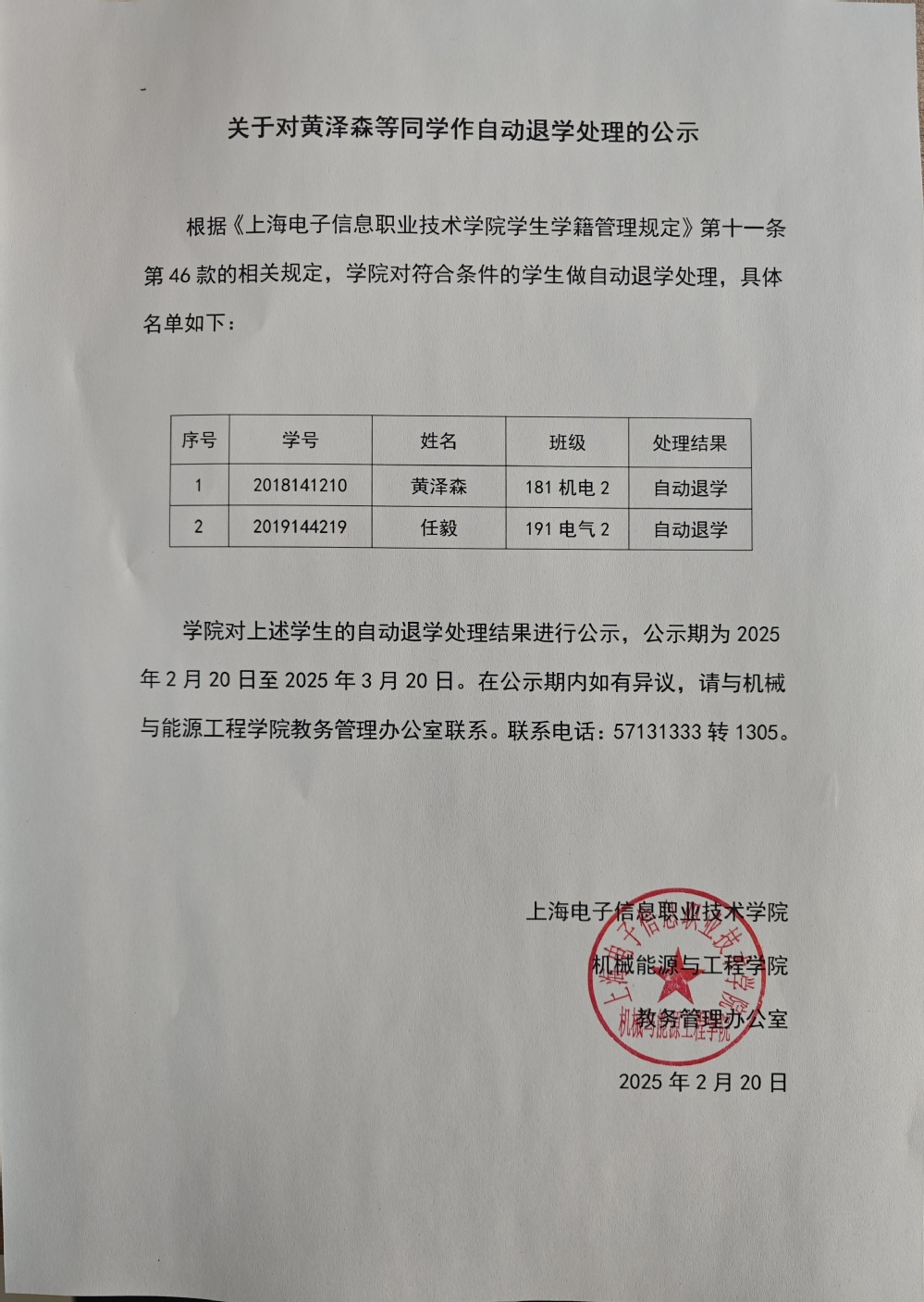 关于对黄泽森等同学作自动退学处理的公示