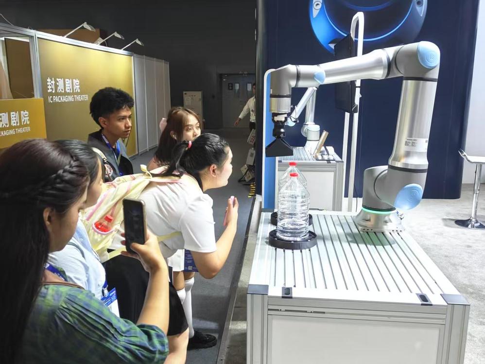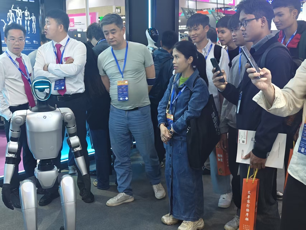 留学生们对协作机器人和人形机器人等表现出浓厚兴趣,并与参展商交流互动。