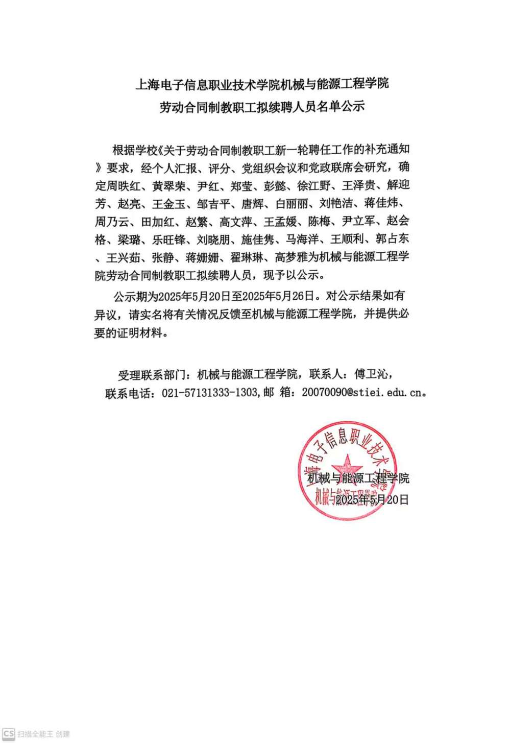 上海电子信息职业技术学院机械与能源工程学院劳动合同制教职工拟续聘人员名单公示