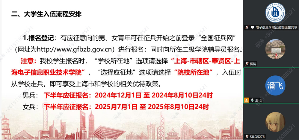 为深入贯彻习近平强军思想,激发青年学子投身国防事业的热情,6月5日,机械与能源工程学院联合学校武装部通过线上平台召开2025年征兵政策宣讲会。