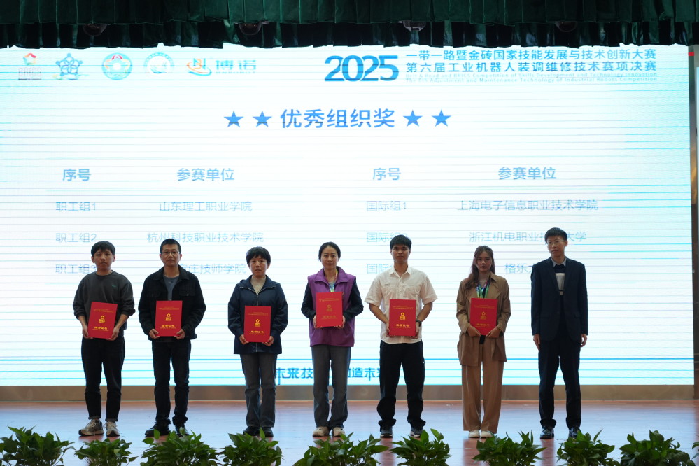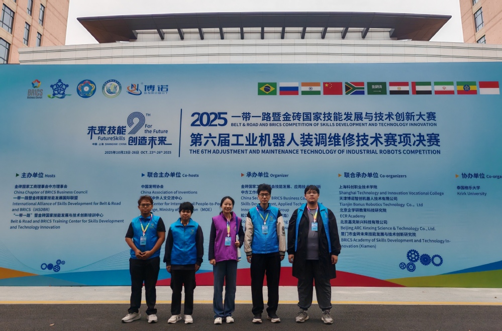 10月23日至26日,2025一带一路暨金砖国家技能发展与技术创新大赛第六届工业机器人装调维修技术赛项决赛,在上海科创职业技术学院举办。我校机械学院4名选手,从全球152名选手中脱颖而出,泰国学生Peeraphat Moohamod获二等奖、Mongkhon Talunial获三等奖,中国学生沈泽昊获三等奖、王海涛获优胜奖,学校斩获优秀组织奖。