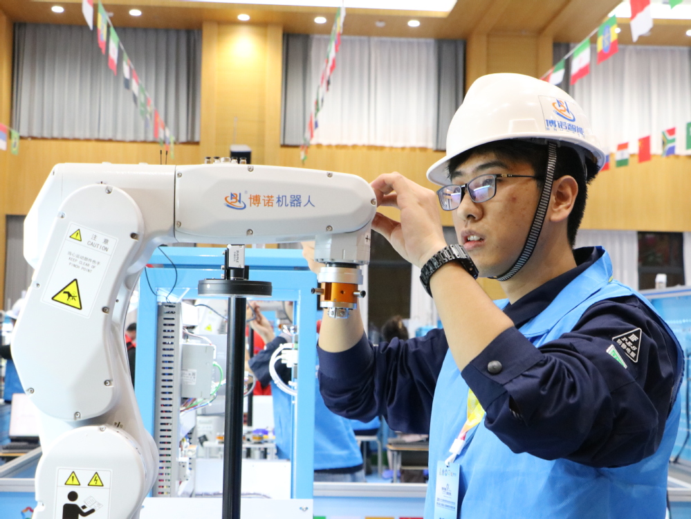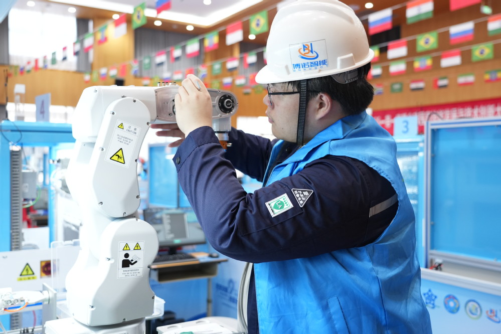 赛场上,4名选手各展所长。泰国选手凭借对机器人的熟练操作,在编程调试环节取得高分;中国选手在2-6轴虚实拆装、电路排故、控制系统调试等环节获得裁判认可。虽是个人赛,但选手间良性交流成亮点。赛前集训时,4名选手常研讨操作技巧与故障排查思路。比赛间隙,他们主动分享对任务的理解,实现技术互鉴。泰国选手表示,“竞技不排他、竞争亦互助”的氛围让比赛更具意义。