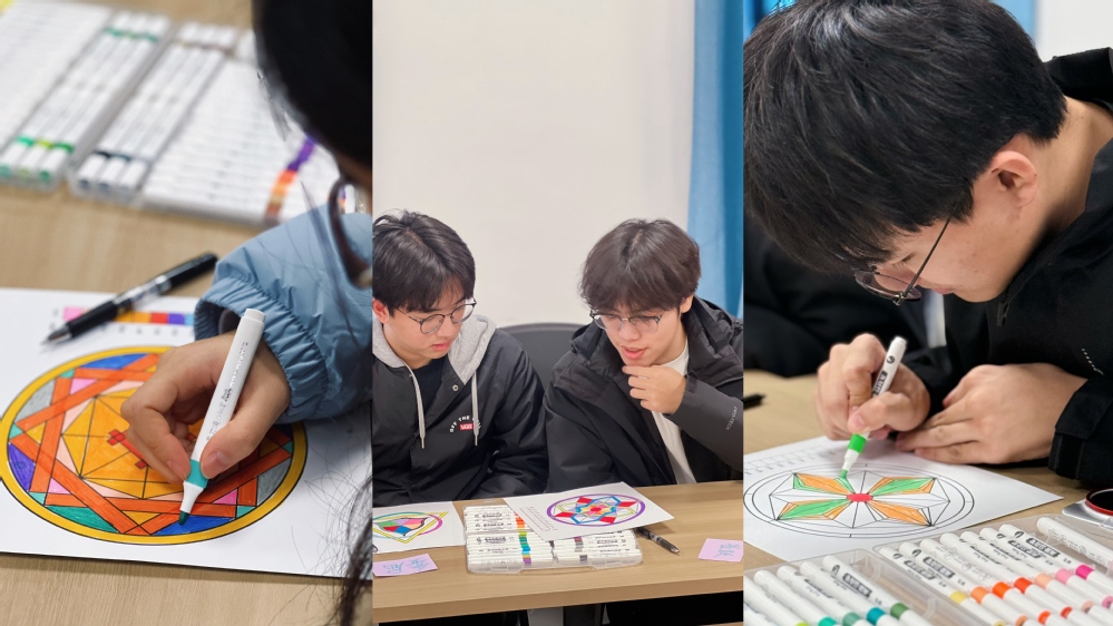 活动伊始,暖身环节的“情绪接力”打破了陌生感,同学们用肢体动作与拟声词传递情绪,在互动中感受情绪的共通性与独特性。核心环节中,大家专注于曼陀罗涂色创作,以色彩为媒介表达近期的情绪状态——明亮的黄橙诉说喜悦,柔和的粉蓝流露疲惫,浓烈的红紫传递焦虑。在领导者的引导下,同学们分享作品背后的情绪故事,通过“亮色点缀”的方式为负面情绪注入正向能量,在小组交流中汇总出听音乐、运动等实用调节方法。