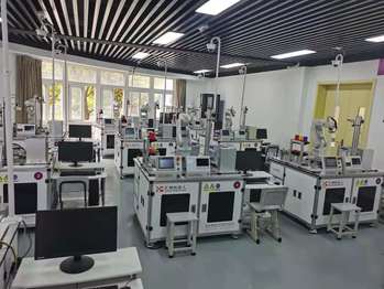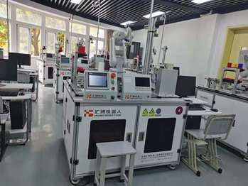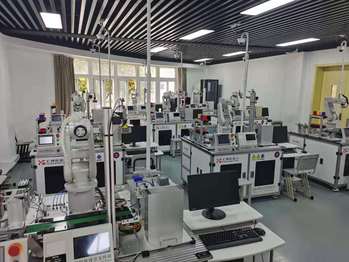 实训室位于N楼实训中心103室,有工业机器人集成设备10套。设备有智能检测和装配工作站组成,工作站由ABB工业机器人、上料单元、输送单元、快换装置、立体库、变位机、绘图模块、视觉检测、RFID模块和装配模块组成。设备模拟机器人装配电机、输出法兰、成品放置仓库等任务。主要包含工业机器人技术、PLC控制技术、传感器技术、机器视觉技术、伺服驱动等工业机器人集成技术,培养学生的工业机器人综合集成能力。